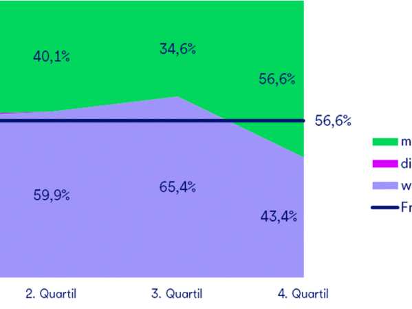 Bei der Betrachtung unserer Statistik ist es wichtig zu berücksichtigen, dass nach wie vor überwiegend Frauen in der GLS Bank in Teilzeit arbeiten. Hier laden wir unsere Mitarbeiter*innen ein, die Betreuung der Familie fair und bedarfsorientiert zu organisieren. Unsere flexiblen Arbeitszeitmodelle bieten allen Mitarbeitenden die Möglichkeit, ihre Familienbetreuung angemessen umzusetzen. Trotzdem ist es ein erfreulicher Erfolg, die Frauenquote in der GLS Bank, insbesondere auf den Führungsebenen, erhöht zu haben.