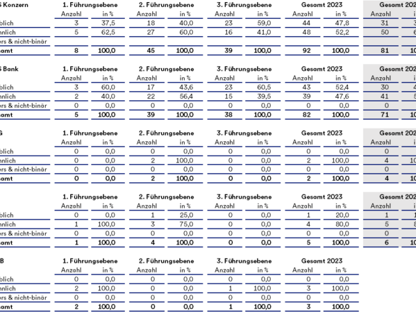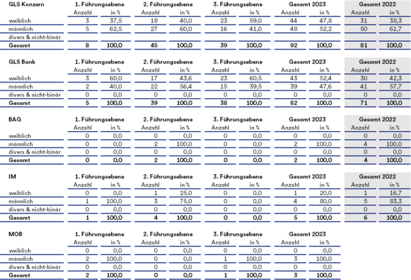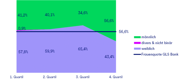 Das Fördern und Leben von Gendergerechtigkeit ist uns ein wichtiges Anliegen. Deswegen bewegen wir das Thema auf verschiedenen Ebenen in der GLS Bank weiter, sowohl politisch als auch unternehmensintern. Auf Unternehmensebene hatten wir uns für das Jahr 2023 das Ziel gesetzt, die Quote von Frauen in Führungspositionen weiter zu erhöhen. Wir freuen uns, dass wir diesem Ziel nicht nur auf Ebene der Geschäftsleitung, sondern auch auf einzelnen Führungsebenen und in der Betrachtung der Gesamtbank gerecht geworden sind.