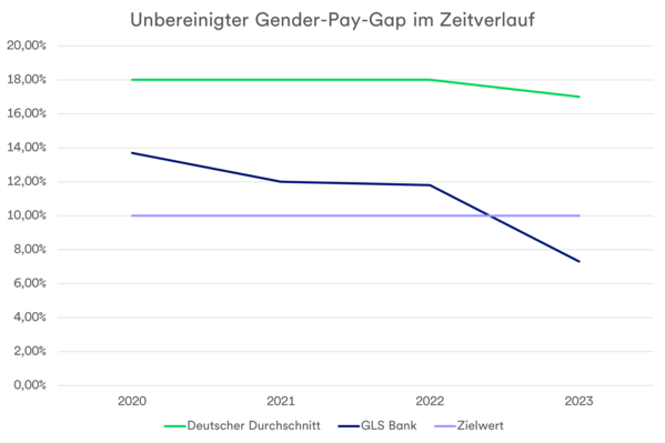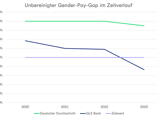 Mit einem Gender Pay Gap von 7,3 Prozent zum Jahresende 2023 haben wir das Ziel erreicht und halten laufend die Entwicklung des Gender-Pay-Gap im Blick. Dies geschieht bei jeder Neueinstellung und Einkommenserhöhung. Der Gender-Pay-Gap wird pro Team explizit ausgewiesen, um eine Sensibilisierung der Führungskräfte zu erreichen. Dies erfolgt quartalsweise, wobei die individuellen Gehaltskomponenten sowie die daraus resultierenden Durchschnittsverdienste weiblicher und männlicher Mitarbeitenden abgebildet werden. Seit der ersten Ermittlung des Gender-Pay-Gaps der GLS Bank zum 31.12.2020 konnte dieser im Laufe von drei Jahren um mehr als 6 Prozent-Punkte reduziert werden. Für den Gender Pay Gap haben wir uns als neues Ziel gesetzt, uns sukzessive weiter zu verbessern und kurzfristig die 7 Prozent-Grenze zu unterschreiten.