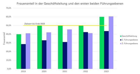 Das Ziel einer Frauenquote von 50 Prozent ist in den Führungsebenen unterhalb der Geschäftsleitung (nur) bei gemeinsamer Betrachtung der 2. und 3. Führungsebene erreicht.