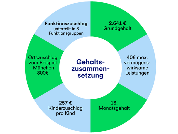 Das Einkommen in der GLS Bank setzt sich aus Grundeinkommen, Funktionsanteil und Sozialanteil zusammen. Das Grundeinkommen ist für alle vollzeitbeschäftigten Mitarbeiter*innen gleich, derzeit 2.865,00 Euro brutto pro Monat. Dazu kommen vermögenswirksame Leistungen von bis zu 40,00 Euro pro Monat sowie ein 13. Monatsgehalt. Die nebenstehende Abbildung zeigt die Zusammensetzung eines monatlichen Einkommens unserer Mitarbeitenden. Der Sozialanteil berücksichtigt individuelle soziale Situationen. Pro Kind zahlen wir unseren Mitarbeitenden einen Zuschlag von 279,00 Euro. Der Ortszuschlag berücksichtigt die Lebenshaltungskosten aller Mitarbeiter*innen mit ihren Familien am jeweiligen Standort. Ebenso erhalten alle Mitarbeiter*innen für die An- und Abfahrten zum Arbeitsort ein JobTicket. Der Funktionszuschlag bringt die unterschiedlichen Anforderungen, Kompetenzen, Verantwortungen und Qualifikationen unserer Mitarbeiter*innen zum Ausdruck. Hinzu kommen Aufschläge für Berufsjahre. Es gibt acht Funktionsgruppen, deren Einteilung in Absprache mit den Führungskräften, der Abteilung Menschen und Wertekultur und dem Vertrauenskreis stattfindet.