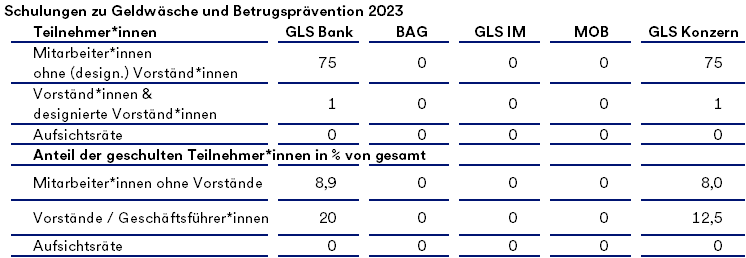 Im Jahr 2023 fanden beispielsweise folgende interne überfachliche Weiterbildungen statt: Moderations- und Kameratrainings, Stimmtrainings „Klare Stimme. Klare Botschaft.“, Bank für Nichtbankkaufleute, Visualisierungstraining, Excel-Schulungen, Schulungen zur Nutzung von LinkedIn. Zudem nahmen 12 Mitarbeitende an der 14. International Summer School on Social Banking & Sustainable Finance des Institute for Social Banking teil. Zu den externen und internen Angeboten sowie zu individuellen Weiterbildungsfragen bieten wir intern individuelle Beratung an.