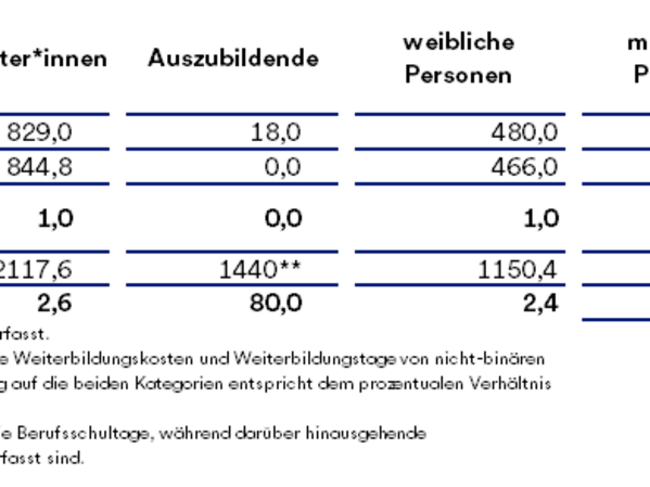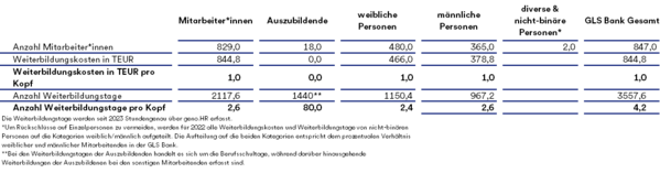 Im Jahr 2023 hat die GLS Bank Weiterbildungskosten in Höhe von ca. 845 Tausend Euro für ihre Mitarbeiter*innen aufgewendet. Dabei wurden 55,2 Prozent der Gesamtaufwendungen für Frauen und 44,8 Prozent für Männer aufgewendet. Insgesamt kamen Mitarbeiter*innen der GLS Bank auf 2.118 Weiterbildungstage; Auszubildende kamen auf 1.440 Tage.