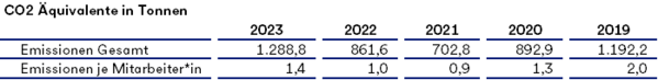 Mit knapp 109.000 mobilen Arbeitstagen im Jahr 2023 wurden die daraus resultierenden Emissionen auf 177,8 Tonnen CO2-Äquivalente geschätzt. Die Treibhausgasemissionen der mobilen Arbeit setzen sich aus dem durchschnittlichen Bedarf an Stromverbräuchen für Laptop, Bildschirm, Router, Internetnutzung und dem zusätzlichen Wärmebedarf zusammen. Der Anteil der mobilen Arbeitstage lag 2023 bei 53 %.